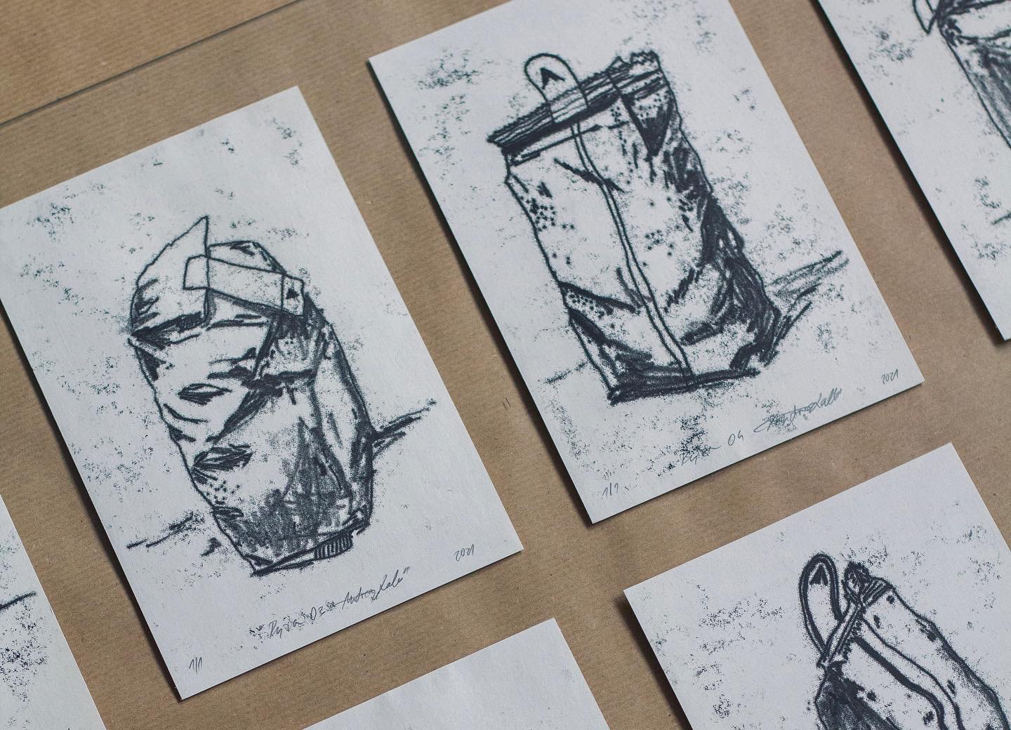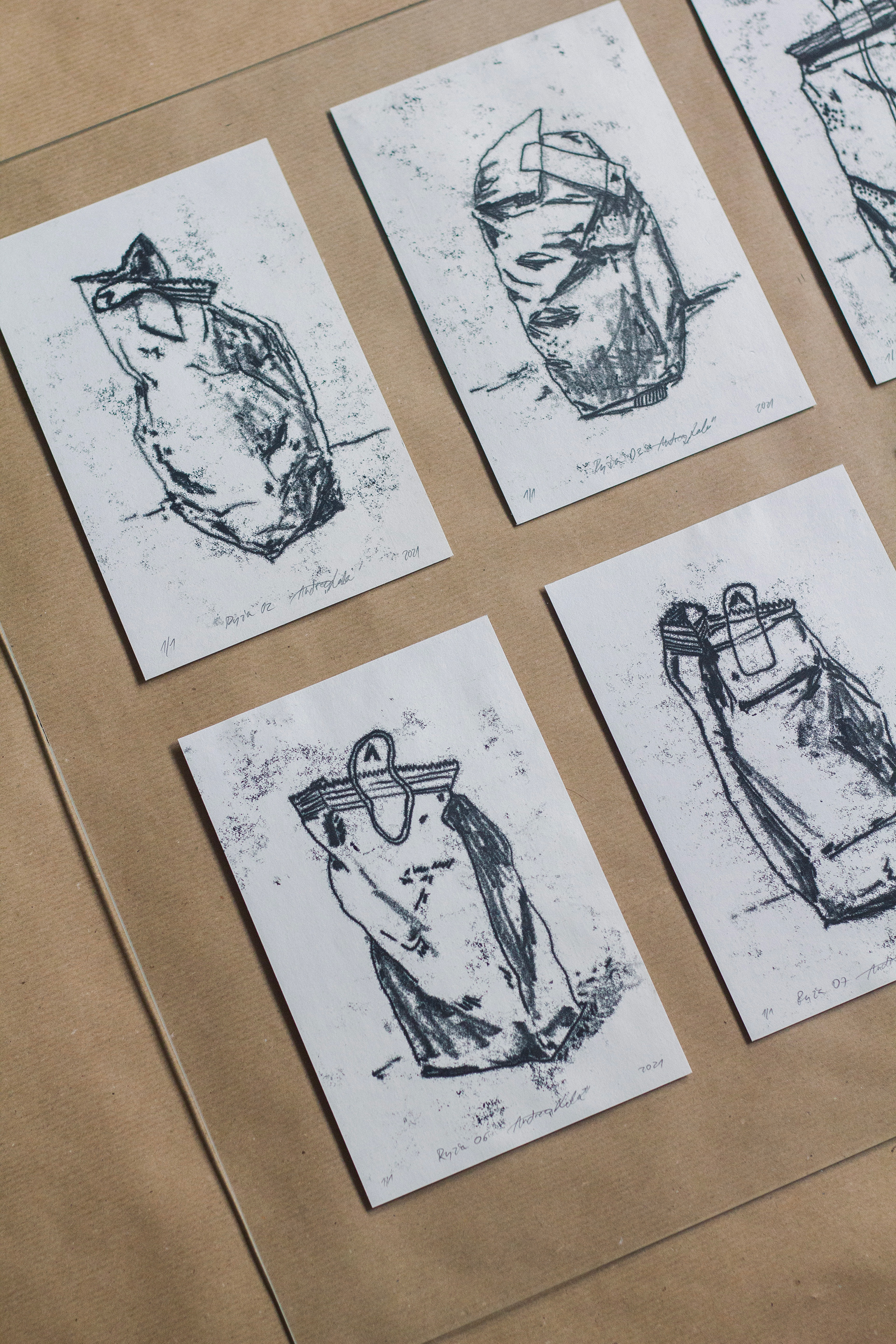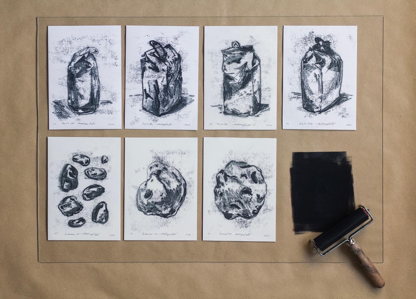 Monotype prints of stones and rice in isolation.