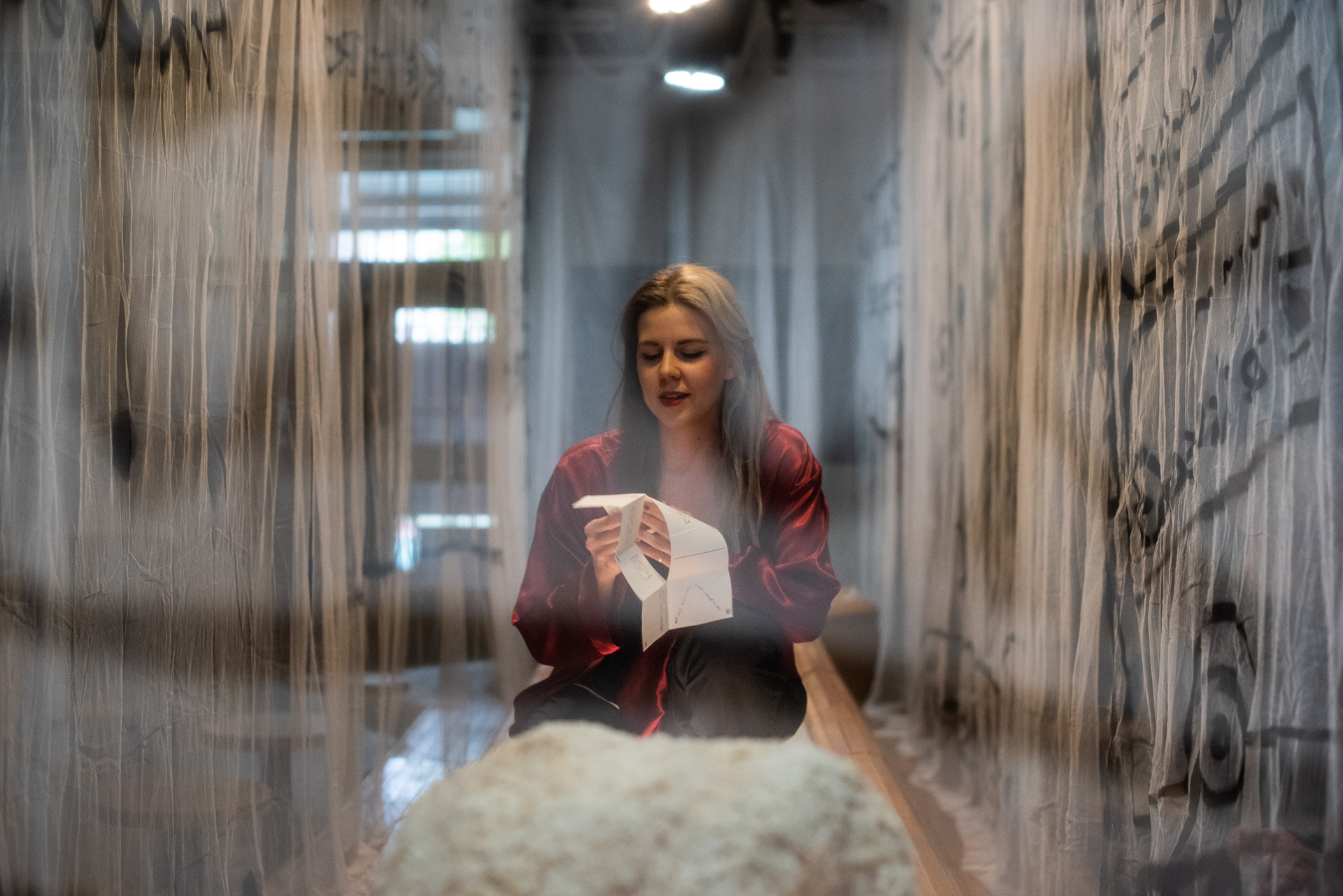Tretia výstava – INTERIÉRY INTERIÉROV, hovorí o tom, aké hlučné to môže byť v pokoji. Okrem objektov bude súčasťou výstavy aj text, ktorý „nebol špeciálne editovaný pre oko čitateľa, neprešiel korektúrami, ktoré by z neho spravili niečo ľúbivé, pretože mi išlo o zaznamenanie bezprostredného, úprimného vhľadu do aktuálneho prežívania. Text a celá inštalácia otvárajú možnosť nahliadnuť do môjho vnútra, interiéru a pozývam diváka na komunikáciu o jeho vlastnom interiéri.“