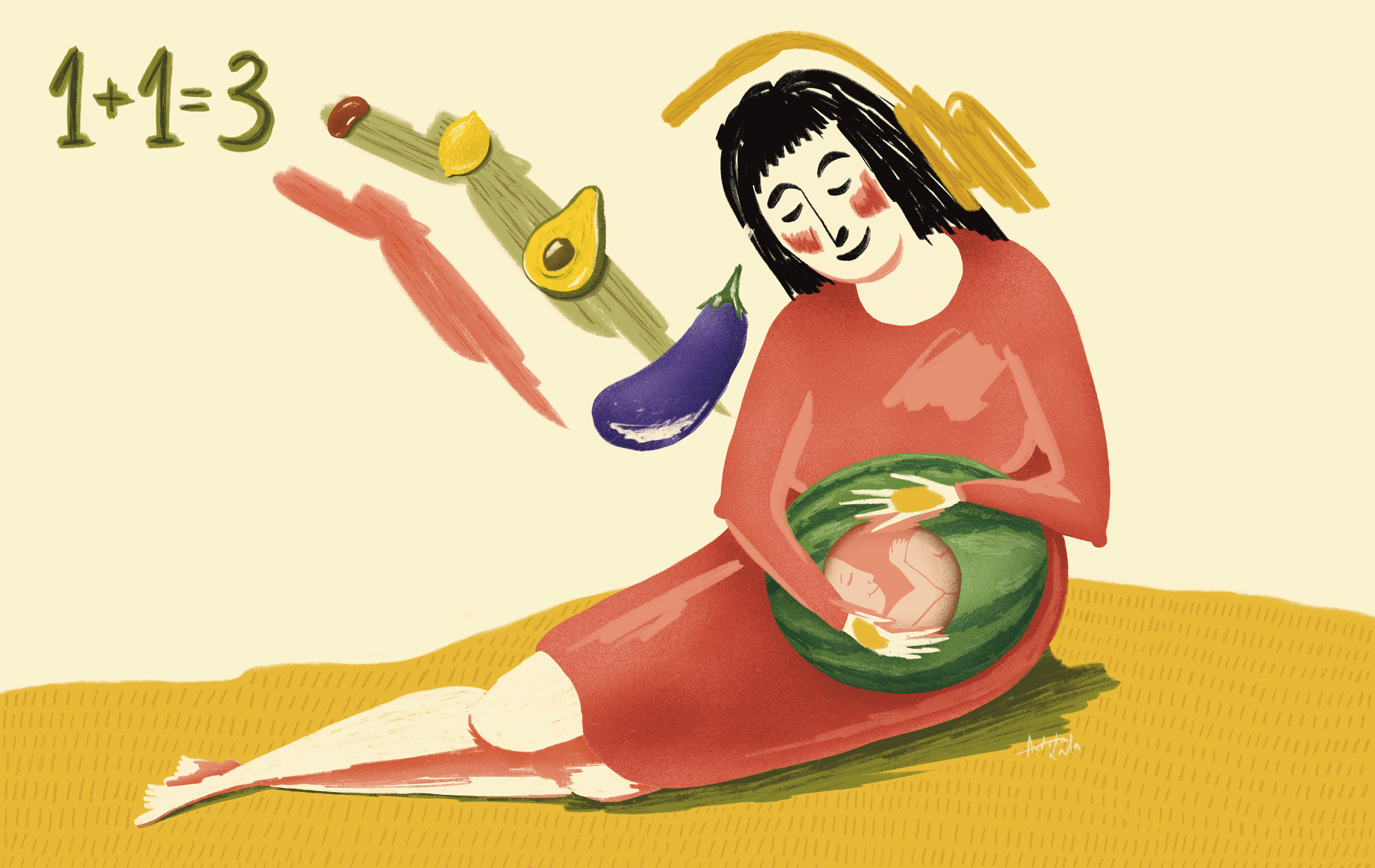 An illustration for Bublina magazine about the growth of babies compared to vegetables.